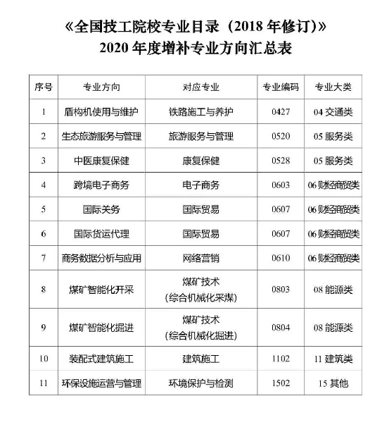 为贯彻落实《国家职业教育改革实施方案》和《技工教育“十三五”规划》,加强技工院校专业建设,人力资源和社会保障部组织开展了《全国技工院校专业目录(2018年修订)》(以下简称《目录》)增补工作,研究确定新增31个专业,新增列举11个专业方向,现予公布。